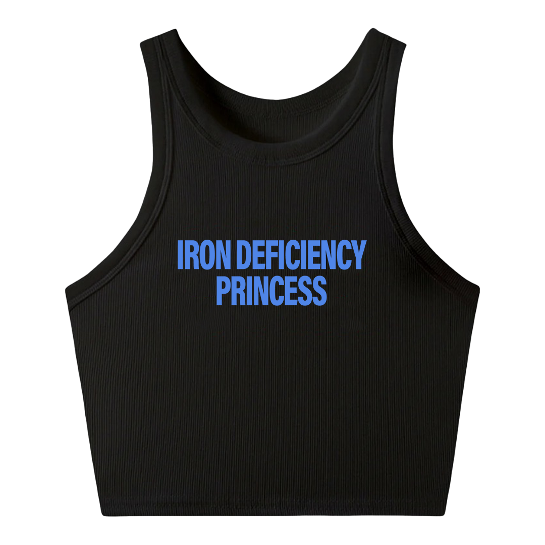 Fainting? Cute. Craving ice? A lifestyle. This body-hugging, slightly anemic tank top is for the girls who run on caffeine, chaos, and maybe one (1) vitamin a week. If standing up too fast feels like a near-death experience, you might just be royalty. 👑✨